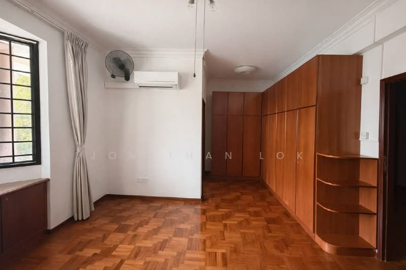Spacious and well-appointed master bedroom available in a Singapore landed property. Features a queen-sized bed, generous built-in wardrobe storage, and a beautiful bay window that fills the room with natural light.