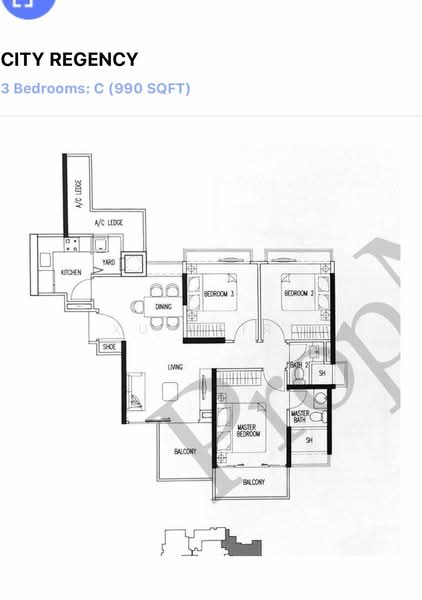 Spacious 3 bedroom, 990sqft