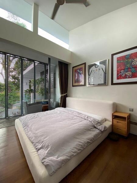 Serviced Bedroom. Modern, High Ceiling, King size bed w Ceiling fan.