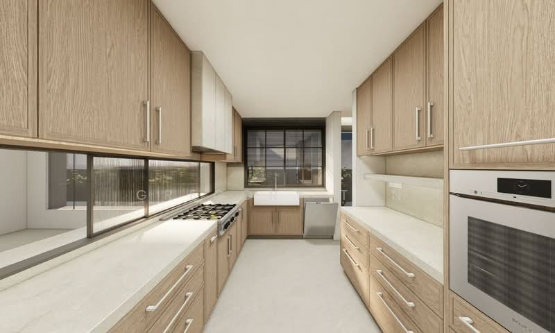 A carefully curated material palette defines the interiors, featuring natural stones such as Gris Versailles and Fior de Pesco, paired with large-format tiles for a seamless, understated finish. The kitchen is fitted with premium Fisher & Paykel appliances and Caesarstone quartz worktops, while bathrooms are appointed with sleek Australian Phoenix fittings for a refined, hotel-like experience.