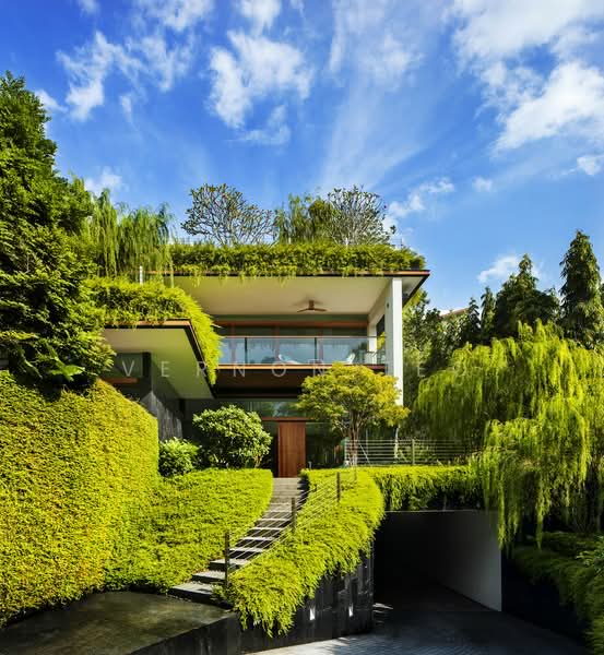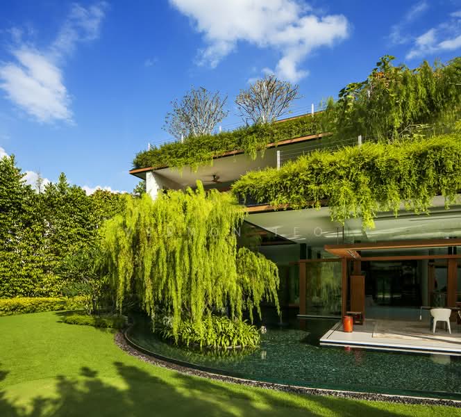 This Bishopsgate home, designed by Guz Architects, is a stunning Good Class Bungalow (GCB) in Singapore. This luxurious property is renowned for its environmentally friendly design, which incorporates lush greenery, rooftop gardens, and solar panels. The house features a unique 23-meter attic swimming pool with a glass floor, which serves as a skylight, bringing natural light into the lower levels. The design also includes a rooftop gym, spacious entertainment areas, and a basement garage that can accommodate six cars or more cars.