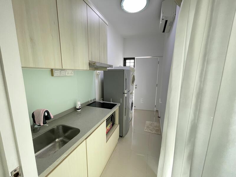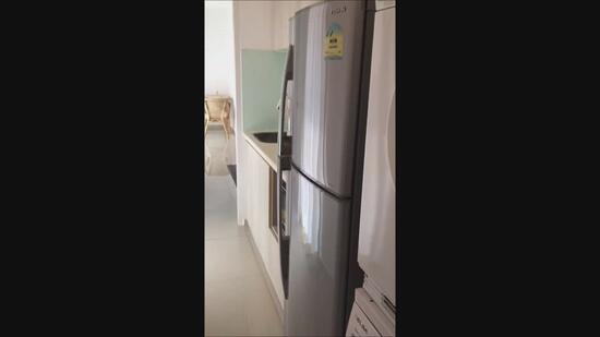 Has fridge, built-in induction stove, kitchen cabinet, dining table and chairs, washing machine, TV, queen-sized bed, walk-in wardrobe and attached bathroom.