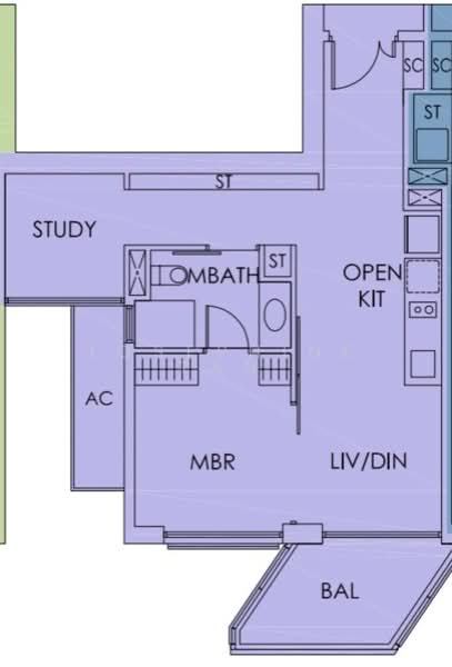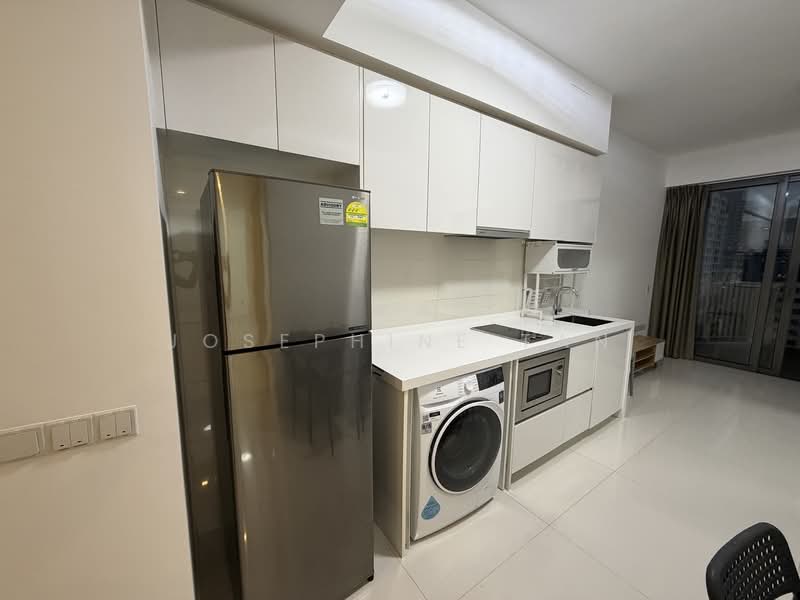 Sky Habitat. The layout is efficient and spacious, with an open concept kitchen area and a Jack-and-Jill toilet arrangement. Currently the unit is furnished with fridge, washer, microwave, oven, sofa, TV, queen bed and a study table with chair. This unit is available immediately and suitable for singles, couples and small families.