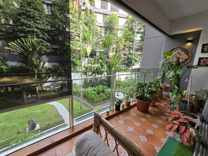 Wide balcony overlooking pool, lawn, and mature tropical greenery