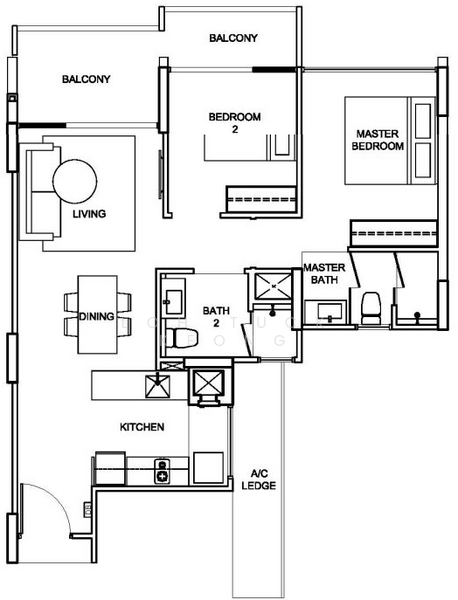 - 2 bedrooms + 2 bathrooms