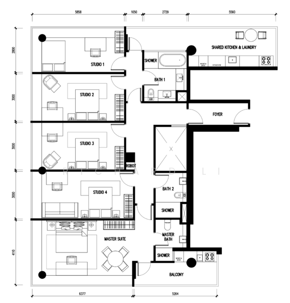 - Private kitchen & laundry for Master Suite, and shared kitchen & laundry for all other studios