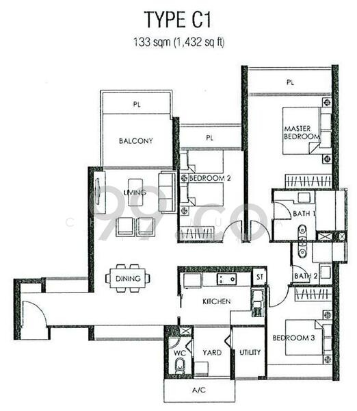 - Spacious 3 Bedroom rectangular layout with balcony and utility area.