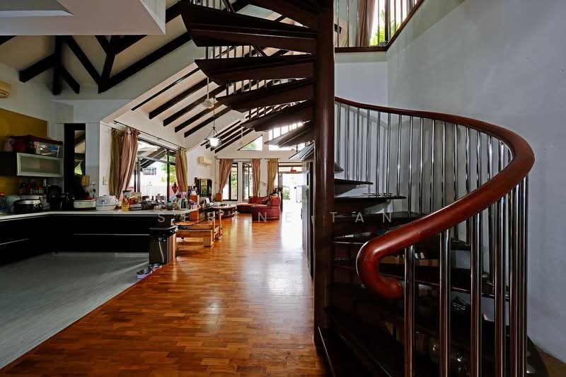 Nestled in the quiet enclave of Seletar Hills estate, this bright and spacious balinese style home features a wide frontage with front and back gardens. The double volume ceiling with the pitched roof creates a grand feeling and promotes good air ventilation. A huge family area overlooks the living and dining areas. The open kitchen layout with a grand living area and internal courtyard is perfect for hosting family and friends.