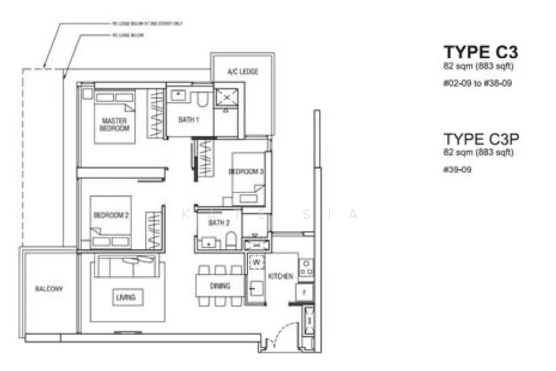 3 bedroom, 883sf