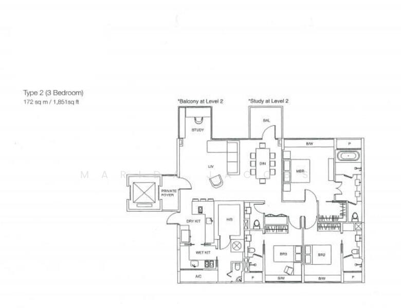 This is a single level 1851sqft unit with 3 spacious bedrooms, all with attached bathrooms, with a spacious living - dining room with a balcony and an enclosed balcony at each end of the living room. There is also a powder room for guests. The kitchen and wet kitchen are equipped with high end Gaggenau appliances. At the back there is a laundry and a helper’s bathroom and a helper’s room.