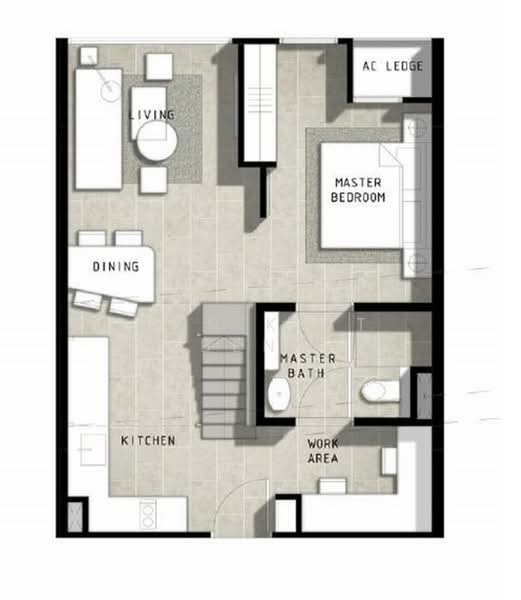 This 570 sqft home stands out with its high ceiling, creating a bright and airy living environment that feels far more spacious than a typical 1-bedder. The loft platform adds a versatile space — perfect as an additional sleeping area or cozy corner, while the lower level remains fully functional for living, dining, and work.