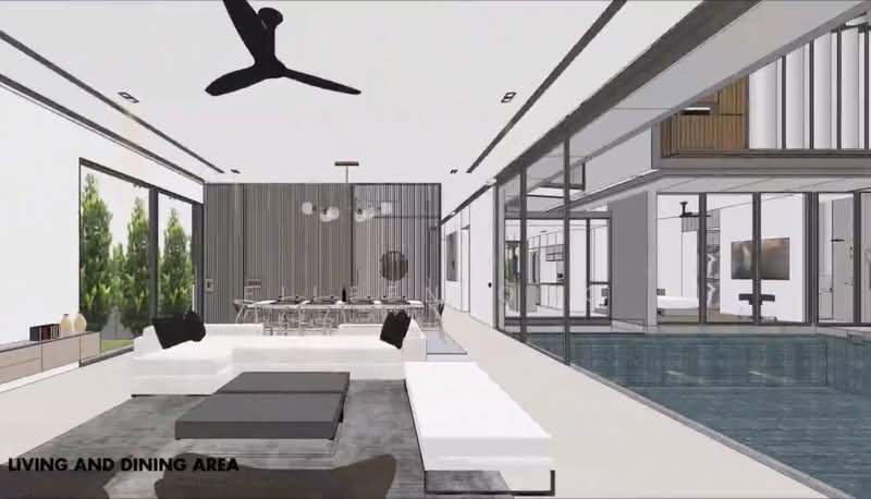 Bright & pool facing living room next to spacious dining area & nice foyer entrance