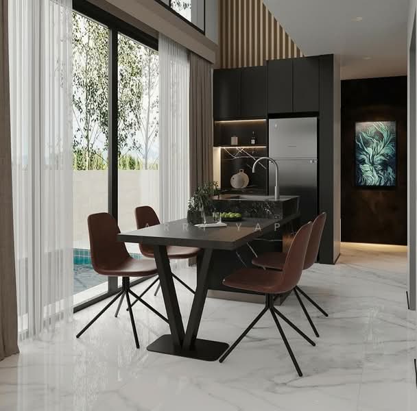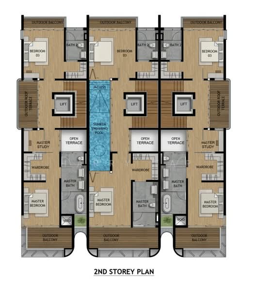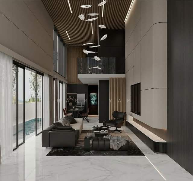 There are four well-sized bedrooms, three with ensuite bathrooms, along with a powder room. The master suite comes with a walk-in wardrobe, study area, and private balcony, offering a comfortable and private retreat. A unique highlight is the elevated sunken swimming pool with jacuzzi on the second storey, adding a luxurious, resort-style element to the home.