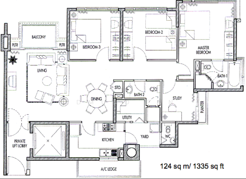 - 3 + study 1335sqft