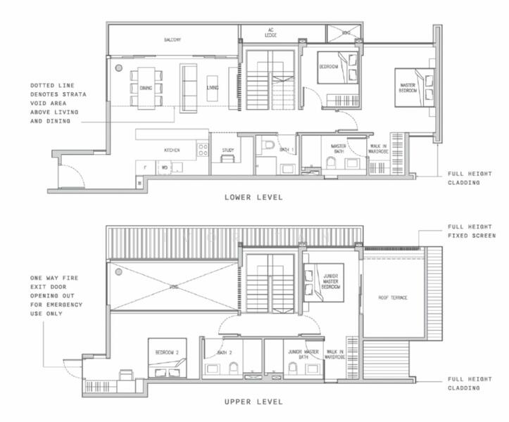 The lower level features a spacious living and dining area with balcony, a well-planned kitchen, a dedicated study, and a comfortable bedroom setup for daily living. The upper level is thoughtfully designed with additional bedrooms, including a junior master with ensuite, and direct access to a private roof terrace, perfect for outdoor entertaining or relaxation.
