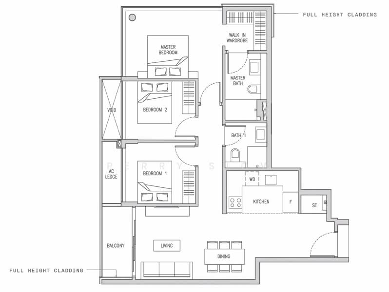 * High‑floor 3 Bedroom / 2 Bathroom layout
