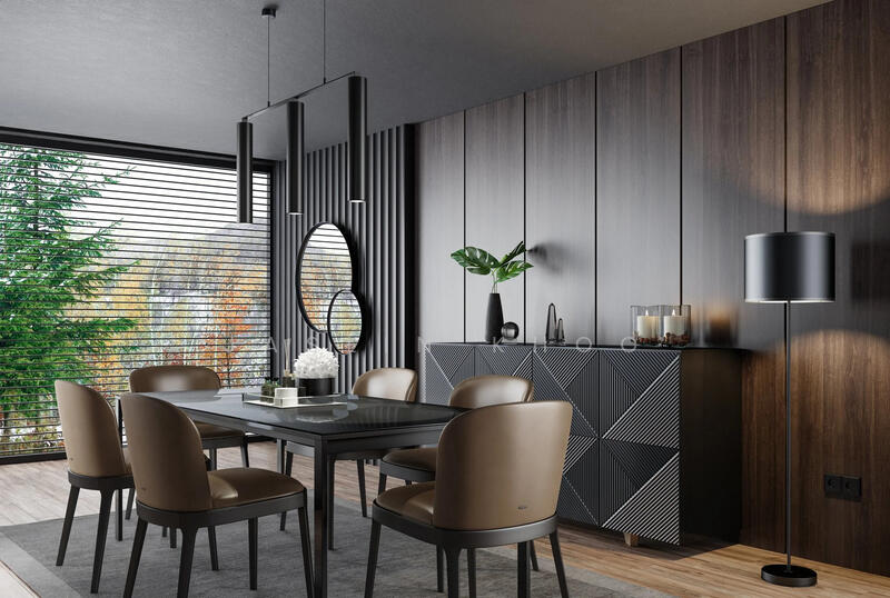 Double-Volume Grandeur: The living and dining halls feature soaring double-volume ceilings and full-height windows, creating a seamless visual connection to the outdoor lap pool.