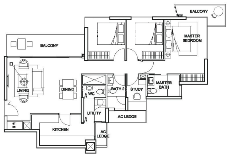 This 3-bedroom + study unit at Foresque Residences sits on a quiet stack, facing greenery and the pool.