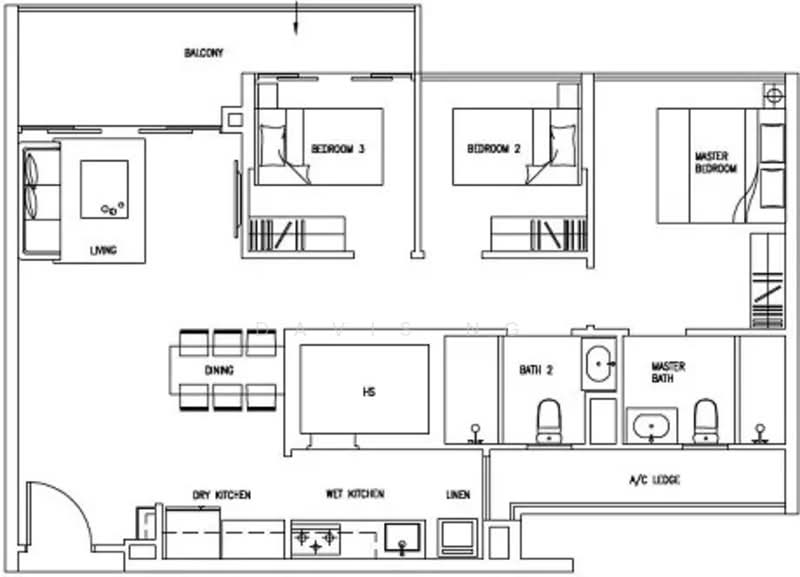 Layout / 布局: 3 Bedrooms + 2 Bathrooms