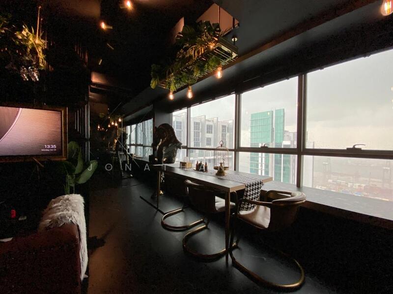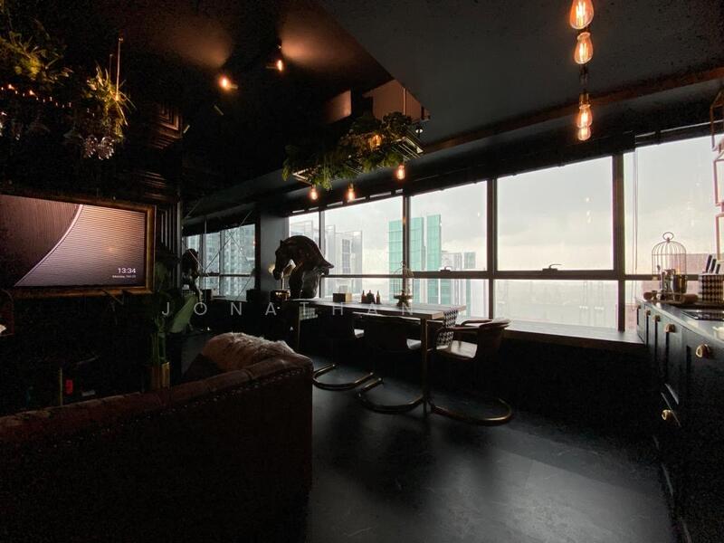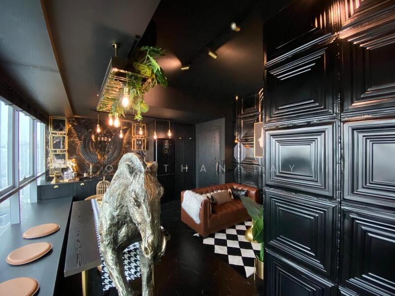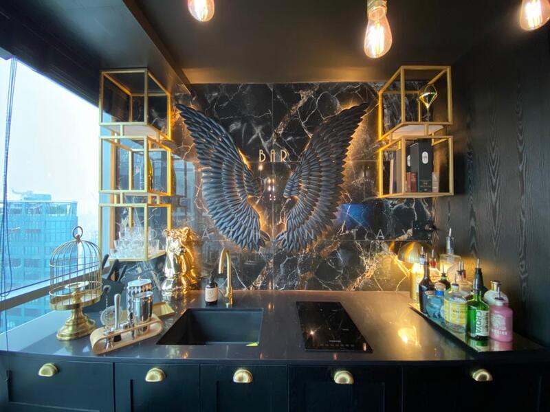 Spanning 624 sqft, this modern unit boasts a sleek design with notable features including a modern kitchen furnishing, air conditioner, false ceiling, and decorative lights, creating a warm and inviting atmosphere.