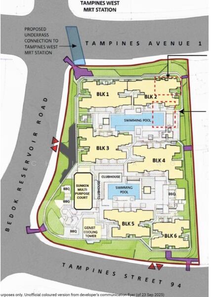 - development with air conditioned shopping mall comprises of F&B, Supermarket, Food Court, Childcare centre, Community Space, direct access to Tampines West MRT station.