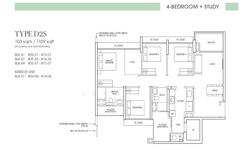 4-Bedroom + Study: 1109sqft (103 sqm)