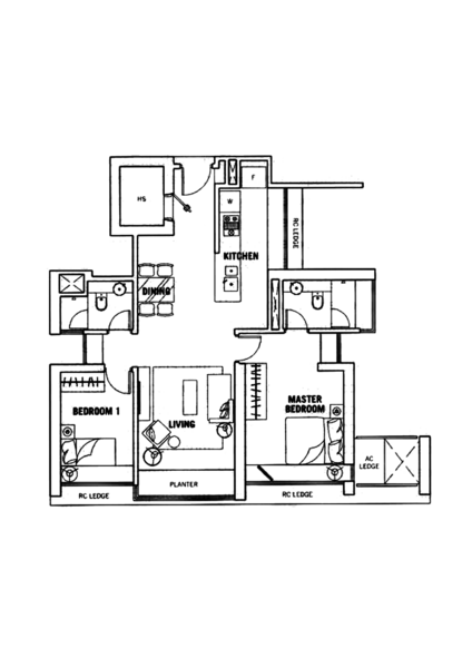 Layout: 2 Bedrooms + 2 Bathrooms (Dumbbell design – efficient & functional)