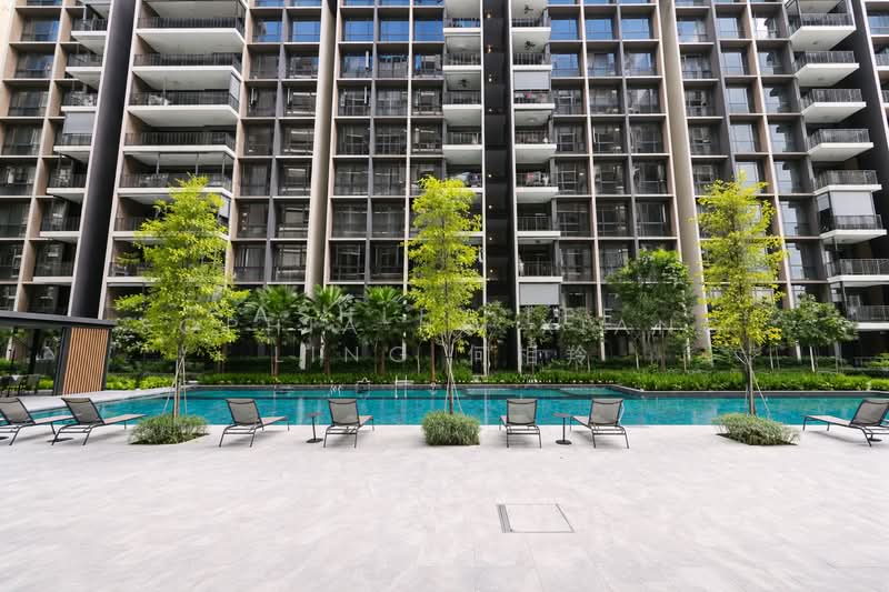 Facing swimming pool and opposite block. Distance to opposite block estimate 29 meter.