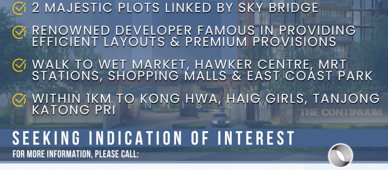 The Continuum stands as a rare freehold condominium at No. 1 to 8, Thiam Siew Avenue, Singapore 436838, within the East Coast / Marine Parade (District 15). Developed jointly by Hoi Hup Realty and Sunway Developments, this condominium blends timeless architecture with modern comfort, appealing to homeowners and investors who value enduring quality and strong potential. Set on a generous land area of about 269,995 sq ft (25,083 sqm), The Continuum comprises 816 residential units housed across six refined blocks reaching up to 17 and 18 storeys. With completion scheduled for 2027, The Continuum exemplifies the essence of freehold living in one of Singapore's most desirable city-fringe neighbourhoods. District 15 has long been known for its charm, coastal proximity, and convenient access to the city. The Continuum captures these qualities while offering a new dimension of luxury and practicality. Homes are designed for diverse lifestyles, from one-bedroom units for individuals or investors to spacious five-bedroom options for families. Each unit maximises light, ventilation, and privacy with efficient use of space. Each home comes equipped with smart home systems that allow remote control of lighting, air conditioning, and appliances. Sustainability runs through the entire development, featuring energy-efficient fixtures, landscaped gardens, and elevated green zones that support wellness and reduce heat gain. The Continuum offers connectivity across Singapore through several nearby MRT stations, including: Paya Lebar MRT station (CC9, EW8) Dakota MRT station (CC8) Mountbatten MRT station (CC7) These stations link directly to the Circle Line and East–West Line, connecting residents seamlessly to major destinations. For those who drive, easy routes via the Kallang–Paya Lebar Expressway (KPE), Pan Island Expressway (PIE), and Nicoll Highway lead quickly to the Central Business District and Changi Airport. Within minutes, residents can enjoy East Coast Park's cycling paths, jogging routes, and seaside dining options. Shopping and entertainment are equally convenient, with Paya Lebar Quarter (PLQ Mall), Kinex, and Parkway Parade offering a full range of retail, dining, and leisure experiences. The Continuum's design emphasises wellness, recreation, and community living. Its extensive facilities span both the North and South zones, connected by a pedestrian overhead bridge that links the entire development seamlessly. 50-metre lap pool and leisure pool Two clubhouses, including the conserved heritage bungalow Two fitness centres and a yoga deck BBQ pavilions and outdoor dining pods Multipurpose recreation courts Children's pool, play areas, and family lawn Aqua gym, sound room, and function rooms Sky gardens and rooftop decks for relaxation Basement car park with direct lift access 24-hour security and concierge-style management Each feature supports a balanced lifestyle, combining active pursuits with spaces for quiet reflection. The result is a residential retreat that blends calm and convenience within the city's rhythm. Families at The Continuum have access to choice schools located within proximity. Educational options nearby include: Kong Hwa School Haig Girls' School Tanjong Katong Primary School This proximity to institutions enhances The Continuum's appeal for families seeking long-term stability and a convenient educational environment. The East Coast and Katong districts are celebrated for their vibrant dining and café culture, offering endless options for residents of The Continuum. Nearby favourites include: Hawkerman Street Kitchen @Haig Road Aunty Lily Kitchen @ City Plaza Tanglin Cookhouse (Paya Lebar Quarter) Retail and leisure destinations such as Parkway Parade, PLQ Mall, and Katong V are within a short distance. The location benefits from proximity to a range of healthcare options, including: Parkway East Hospital Parkway East Urgent Care Centre Trinity Medical Centre (Marine Parade) Neighbourhood clinics and dental centres throughout Joo Chiat, Tanjong Katong, and Marine Parade provide accessible everyday healthcare for families and individuals. Supermarkets and fresh markets surrounding The Continuum offer easy access to daily necessities. Options include: Sheng Siong Hypermarket (Tanjong Katong) FairPrice Joo Chiat Complex Hojiak supper market For fresh produce and local ingredients, Geylang Serai Market and Marine Terrace Market remain favourites among East Coast residents. Set across two interconnected plots, The Continuum’s site plan presents a harmonious blend of modern design and natural landscaping. Its six towers are positioned for privacy, airflow, and natural light throughout the day. The Continuum Freehold Condominium 15 (East Coast / Marine Parade) The Continuum features six towers, four at 17 storeys and two at 18 storeys, offering 816 homes, including one- to five-bedroom units. Approx. 269,995 sq ft (25,083 sqm) One-bedroom (from 560 sq ft) Two-bedroom (from 646 to 807 sq ft) Three-bedroom (from 947 to 1,238 sq ft) Four-bedroom (from 1,130 to 1,690 sq ft) Five-bedroom (from 1,905 to 2,260 sq ft) A pedestrian overhead bridge links the north and south sides, providing smooth access between facilities. The restored heritage bungalow serves as a social and lifestyle hub, while rooftop gardens and green corridors create calming communal areas. The Continuum is developed by Hoi Hup Realty and Sunway Developments, both recognised for their excellence and reliability in real estate. Hoi Hup Realty, based in Singapore, has built a reputation through developments such as Sophia Hills and The Miltonia Residences. Sunway Developments, part of Malaysia's Sunway Group, brings decades of experience in sustainable townships and integrated communities. Here are some notable projects by the same developers: KI Residences At Brookvale: Hoi Hup Realty and Sunway Developments Otto Place: Hoi Hup Realty & Sunway Developments Parc Canberra: Hoi Hup Realty Pte Ltd These develo