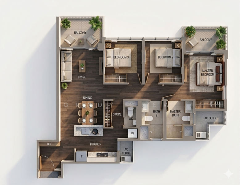 The layout works. The living and dining area flows directly onto a generous enclosed balcony, wide enough to fit a full dining table and still have room for a garden corner. Families use it as an alfresco extension. The high-gloss marble flooring carries through the entire living space, keeping it bright and polished.