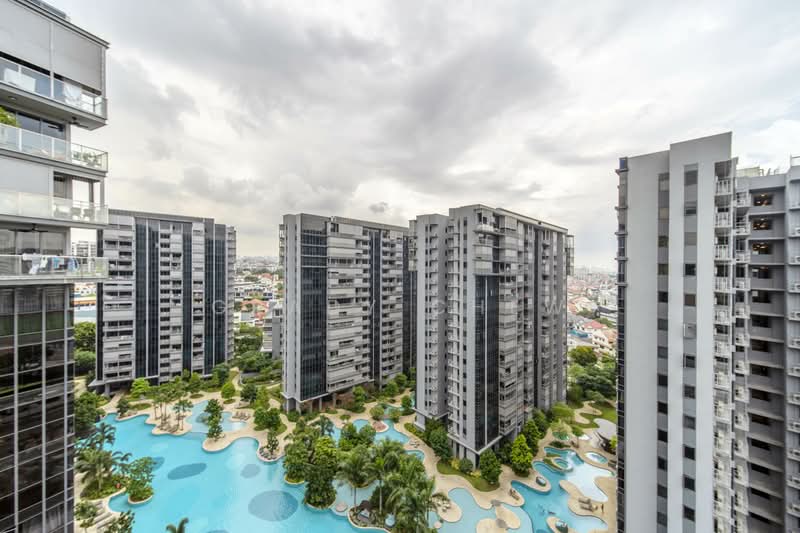The lagoon pool stretches out below, palm trees lining the water, the full resort landscape of Florence Residences laid out in front of you. This is your south-facing view from the balcony.