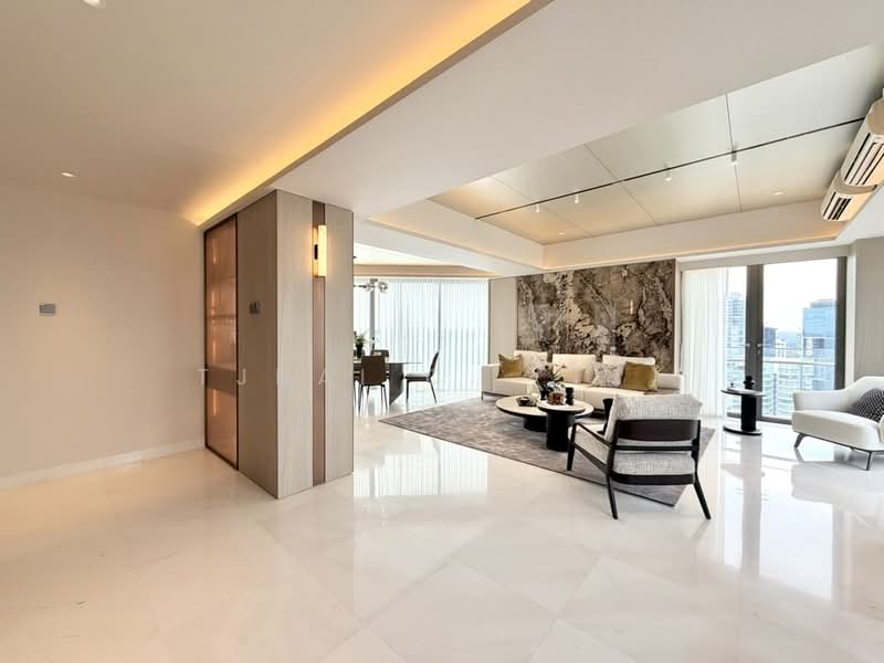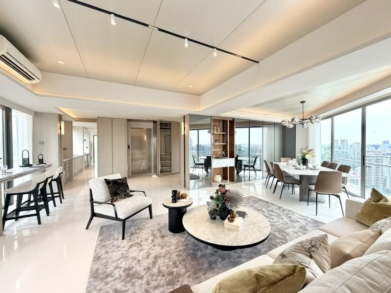 Discover luxury living in this stunning 4 bedroom, 4 bathroom apartment available for sale at 9, Leonie Hill, Singapore. Spanning 3271 sqft, this spacious residence boasts exquisite features including a modern kitchen with high-end appliances, marble flooring, and elegant chandeliers.