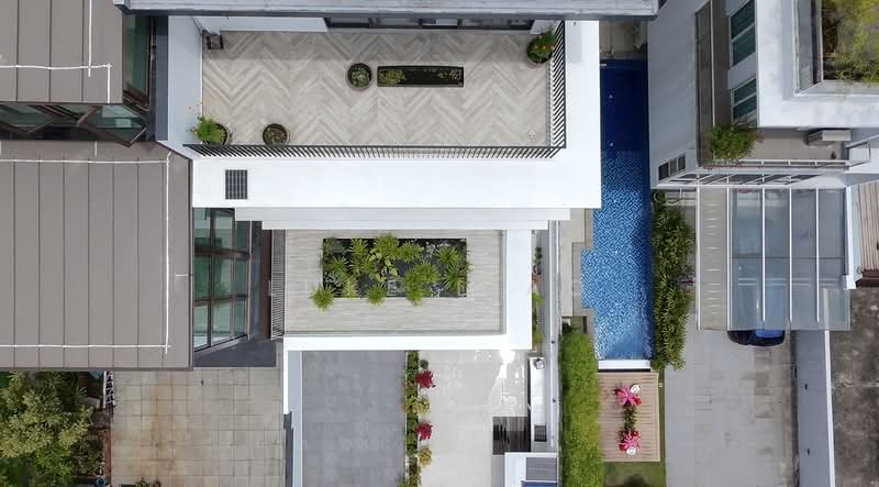 The entire top floor is an entertainment deck spanning across the floor plate: lounge (cinema-ready), bar zone, mini pickleball area, poker table, mahjong, foosball, and gym corner. Dual roof terraces offer lush greenery on one side and city/MBS skyline views on the other, perfect for BBQs, sunsets, and fireworks.