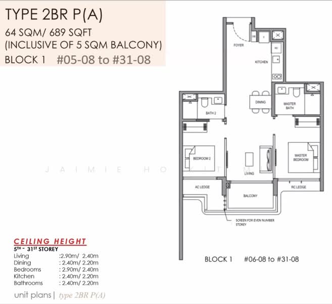 The 2 bedroom size of 689sqft is an efficient dumb bell layout, suitable for single or young couple starting out to live together.