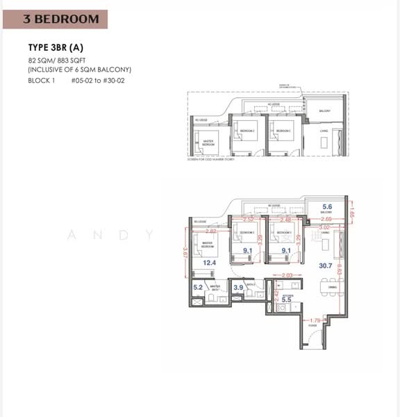 • 3BR: 883 / 893 sqft (87 units)