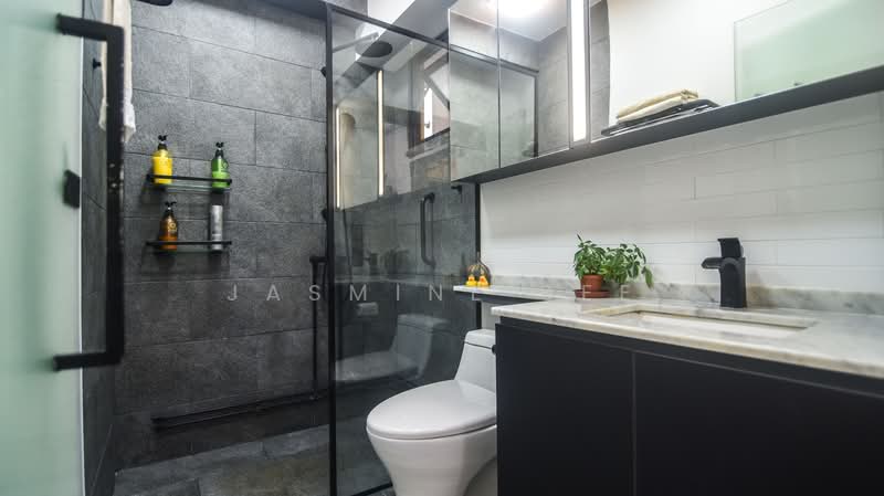 Three bedrooms + two baths flat with condo-quality renovation in centrally located HDB estate. Approximately 968 square feet/90 square meters. Modern black-and-white color scheme.