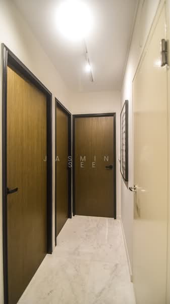 Marble floors (hallway and living room), hardwood floors in all three bedrooms. Bedrooms have custom OPSH closets; living room has custom OPSH floor-to-ceiling shoe closet. New air conditioners, ceiling fans, and track lighting in all bedrooms and living room. All windows have UV-reducing solar film; bedrooms have blackout shades with pelmet mounting. First and second bedrooms have corner windows with double glazing.
