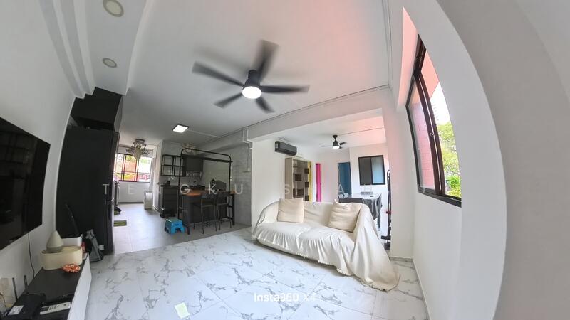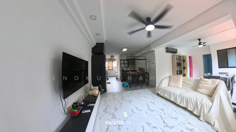 HDB corner unit, low floor, spacious living room with sofa and tv.