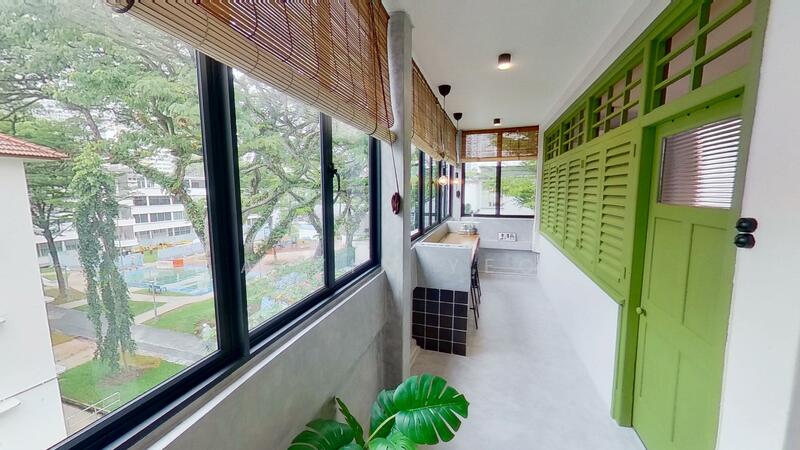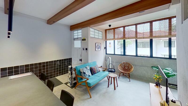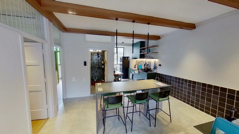 One of the home’s signature features is the original plantation windows, painted green, which add charm while allowing flexible light and privacy control. The living area is versatile and welcoming, complemented by exposed wooden beams that bring warmth and a subtle retro touch synonymous with Tiong Bahru homes.