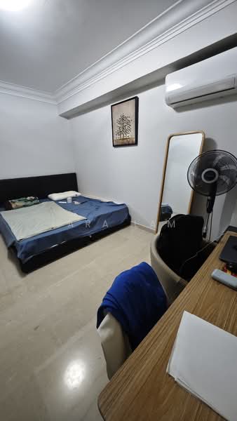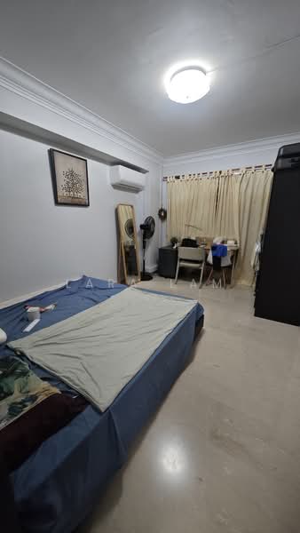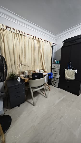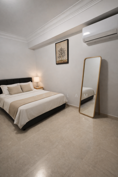 This charming HDB unit features essential amenities such as a cozy bed, a stylish dining table, and spacious bedroom cabinets.