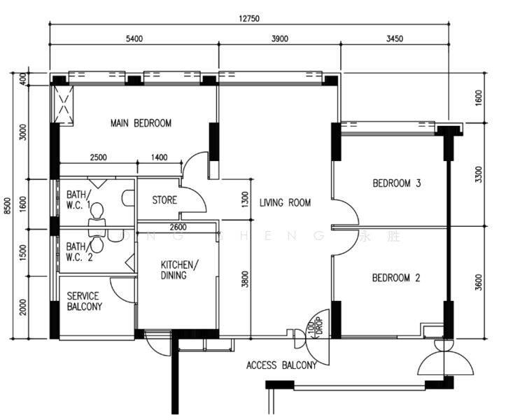 - 3 bedrooms, 2 toilets, living, dining, kitchen