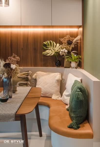 The dining area forms a warm and inviting corner of the home. With its built-in seating, wooden table, and carefully chosen furnishings, it creates a comfortable setting for everyday meals and relaxed gatherings. Soft textures and subtle lighting enhance the atmosphere, adding warmth and depth to the space.