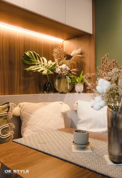 A defining feature of the home is its beautiful colour palette. The pairing of rich wood tones with deep green hues evokes a connection to nature, complemented by thoughtfully placed potted plants that bring life and freshness into the space. Together, these elements create a home that feels modern yet timeless—an environment where thoughtful design, natural textures, and quiet elegance come together in effortless harmony.