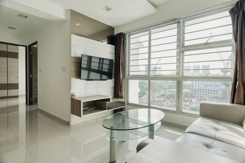 Corner unit with a squarish layout. Kitchen is spacious with 2 rows of cabinets done up. Bright living area. Both bedrooms are spacious enough for a double bed.