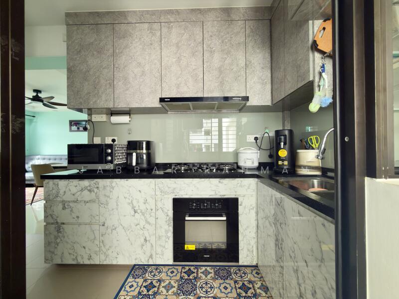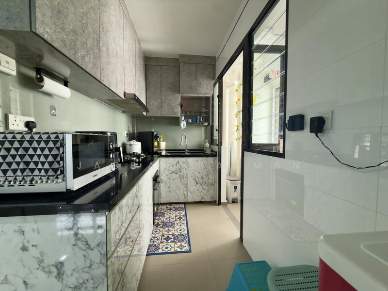 Modern open-concept kitchen with service yard, offering good ventilation and practicality.