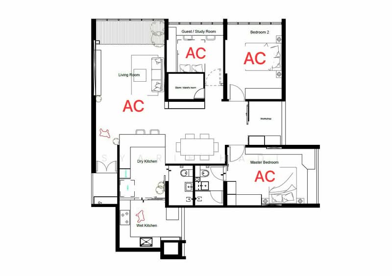 Layout: 3 Bedrooms + Store Room + Study Area + Balcony