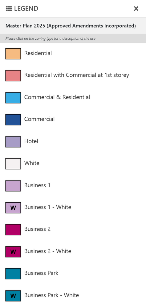 To get the full URA Master Plan legend, click on ‘Find Master Plan Zoning’ on the first page. Then click on ‘Legend’, located right beside the main menu to understand what each colour code stands for. As you move through the map, you can click on the ‘Legend’ button to reference what you’re looking at.