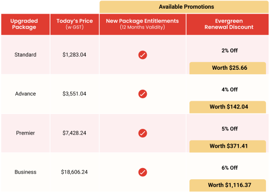 Renew to the same-tier package at today’s price and enjoy the new package entitlements at no additional cost!